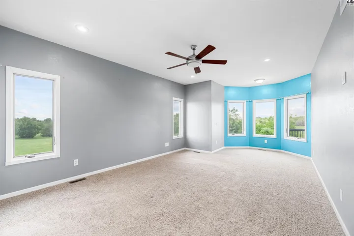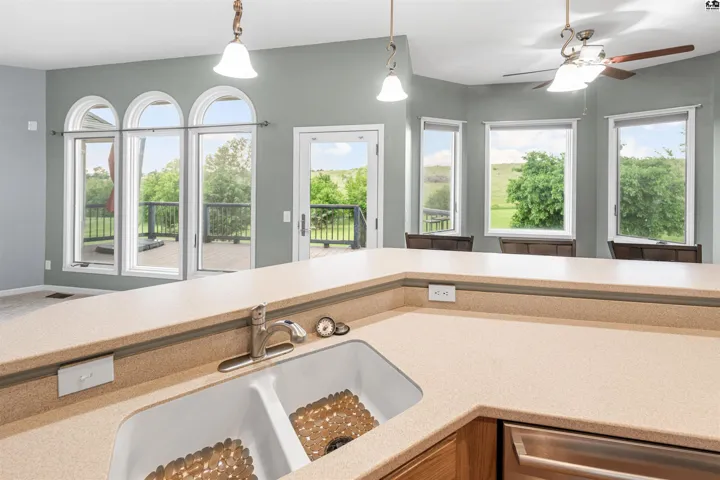 +"PublicRemarks": "This one has it all! Situated on 4.42 acres just minutes from south Salina, with views in every direction and Kansas sunsets that are unbeatable. Built by Brent Sherwood, this all-electric home offers a great floor plan and room to roam. 10 ft ceilings and a grand entry greet you at the front door. Living room with floor to ceiling windows for those evening sunsets. Kitchen with all new appliances, walk-in pantry, breakfast bar, and room for a dining table. Main floor master is very generous and has an amazing master bath! Double sinks and a fabulous walk-in shower, along with a walk-in closet. 2nd main floor bedroom also features a spacious walk-in closet. Full 4-piece bathroom and a great laundry space with soaker sink round out the main floor. The walk-out basement is wonderful! Huge family room, complete with a wet bar and mini kitchen. 2 more oversized bedrooms each with a walk-in closet, and another full bathroom in the basement. Even more in the basement - large storage room, concrete storm shelter, and an office/den space that is currently being used for a home baking business. Enjoy the deck in the evenings. A yard that has endless views. HOA offers use of Swimming pool, golf course and playground for homeowners. You're going to love this one!"
