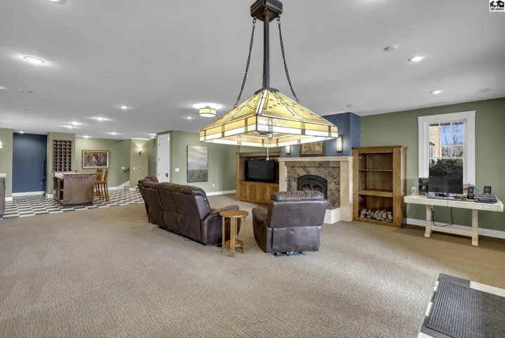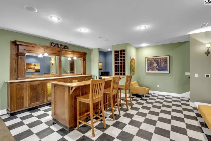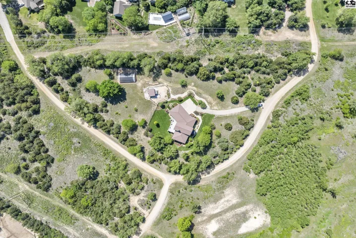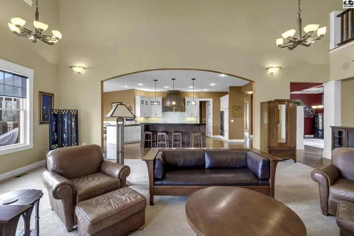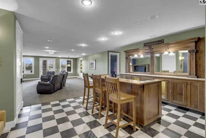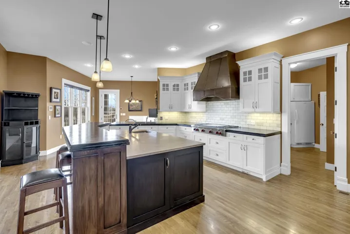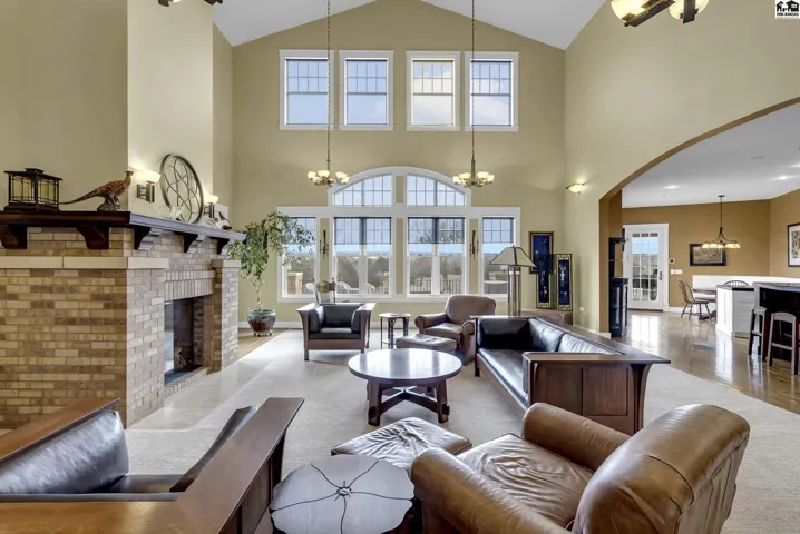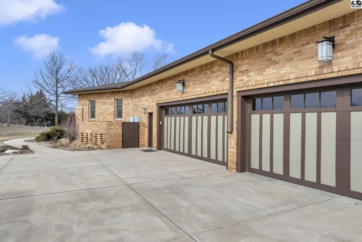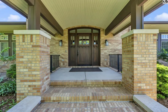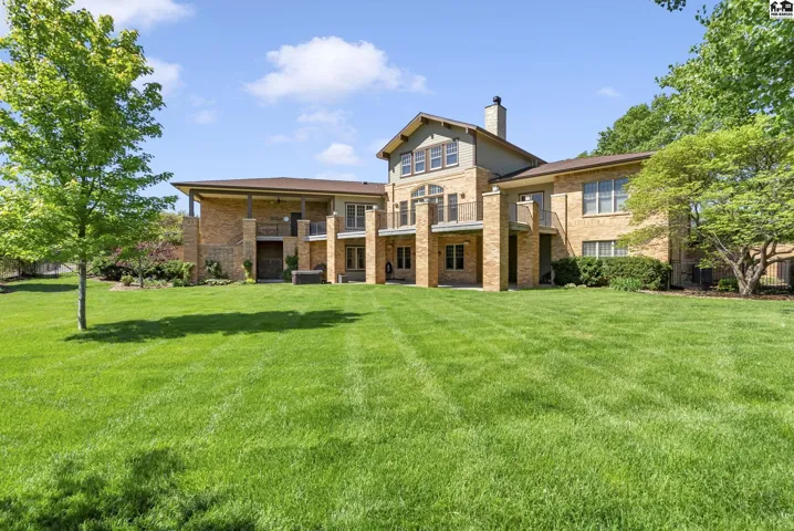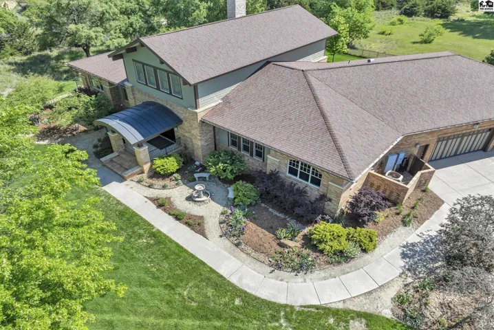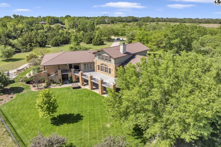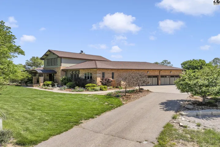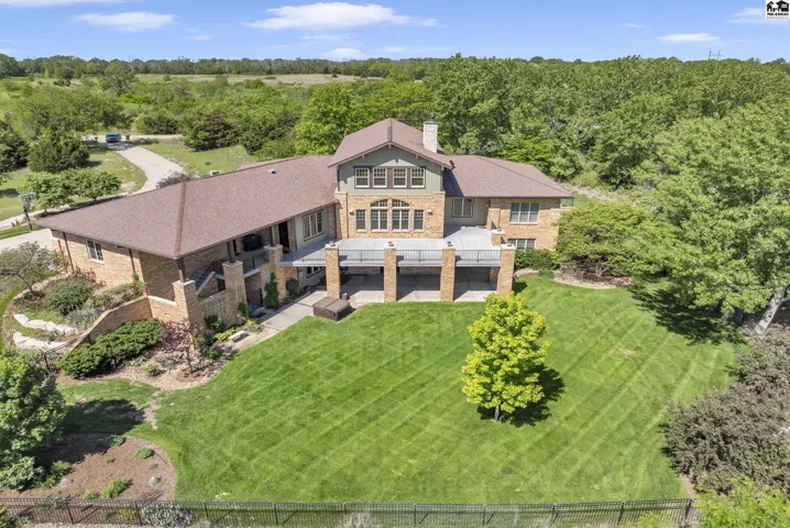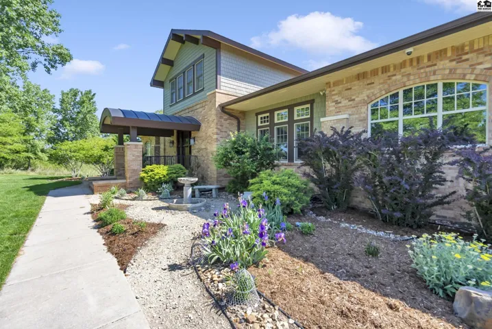 This unique Prairie-Style Craftsman home on 6 acres sits adjacent to the legendary Prairie Dunes Golf Course. Designed to blend with its natural surroundings, it features earthtone brick, native limestone, and fire-resistant concrete shingle siding. Positioned to capture sunrises and sunsets, the home includes a dramatic copper entry, oak front door, expansive deck with columns, outdoor kitchen plumbed for gas and water, and is wired for an outdoor TV. Energy efficiency is top-notch with Anderson windows, high-efficiency HVAC, tankless water heaters, and radiant barrier sheathing. Inside, the main level boasts a stunning 2-story living room with vaulted ceilings, dramatic lighting, and a high-efficiency oak and brick fireplace. The gourmet kitchen includes high-end appliances (Wolf, Thermador, Sub-Zero), custom cabinetry, soapstone and marble countertops, a copper hood, and a large pantry with beverage center. Adjacent is a cozy breakfast nook and a formal dining room with custom ceiling panels. The primary suite offers scenic views, a spa-like bath, and a laundry-equipped walk-in closet. Upstairs, a loft overlooks the living room and treetops—ideal for an office, yoga space, or retreat. The walk-out lower level includes three bedrooms with en-suites, a second laundry room, four flex rooms, a safe room, and a stunning bar/kitchenette with a restored 100-year-old bar back, wine rack, an a slate-and-marble wood-burning fireplace. Custom hardwood trim and window coverings.