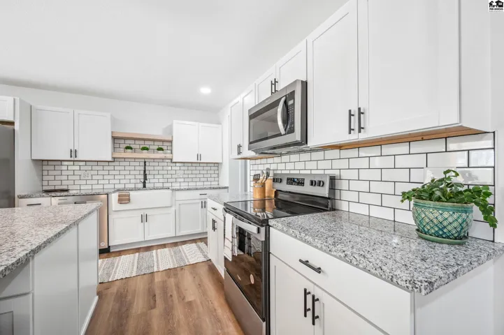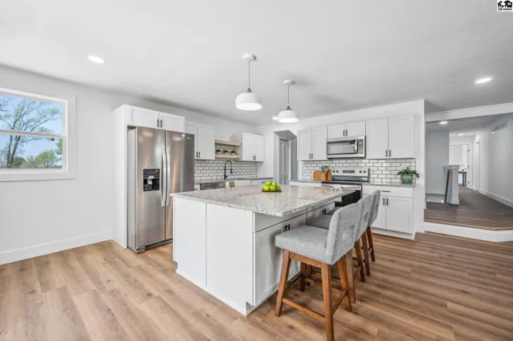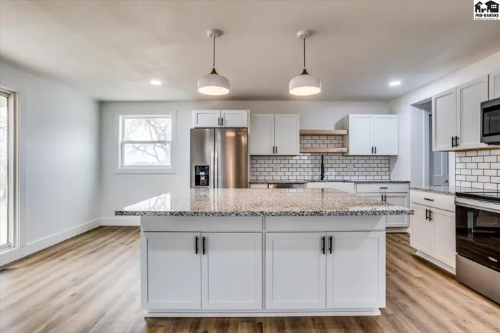 Your DREAM HOME in the beautiful Kansas countryside is here! Located just 35-40 minutes west of Wichita, this beautiful property outside of Murdock, KS, offers a serene escape on nearly 10 picturesque acres, surrounded by mature trees and designed for privacy. This spacious home boasts 5 bedrooms and 3 full baths, all beautifully updated with new flooring, kitchen, bathrooms, lighting, fixtures, paint, windows, and hardware. The main level features an open and airy floor plan, including a versatile bedroom perfect for an office, and a luxurious primary suite complete with a soaker tub, dual vanities, and a walk-in shower. A generous laundry/mudroom and a pantry adjacent to the modern kitchen add to your convenience, with all brand new appliances included! Upstairs, the second story impresses with a cozy living loft space, an additional bedroom, and a full bath, all bathed in natural light from the new windows. The finished basement offers two spacious bedrooms, rounding out this exquisite home with a total of 2,400+ sq. ft. The property features an oversized detached garage with electricity, along with an additional two-car attached garage for storage, vehicles, and lawn equipment. This “like new” home features new siding, a freshly painted exterior, a new porch, a new roof, and a brand new septic system, plumbing, and water heater for your peace of mind. This is truly a rare find in the countryside, and you deserve to make it yours! Schedule a showing today!