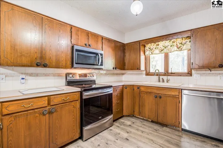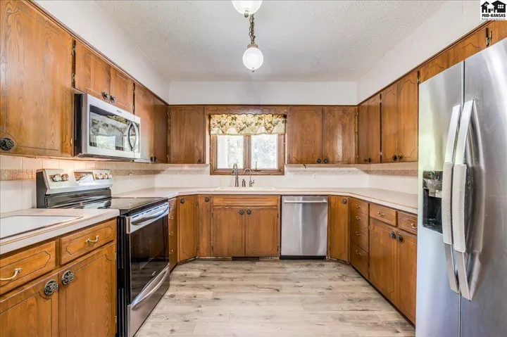 +"PublicRemarks": "THREE BEDROOM, TWO FULL BATH BRICK RANCH with EXTRA LOT TO NORTH. Beautiful yard! Full Basement with LARGE LIVING AREA, STORAGE ROOM, and TWO BONUS ROOMS. New luxury vinyl flooring on main floor, new roof 2021, and newer kitchen appliances. Two fireplaces, main floor laundry, oversized garage and underground sprinkling. New well pumps. Moore water infiltration system. Concrete circle driveway and private back yard. Buhler Schools!"