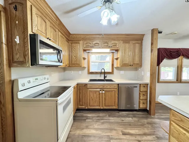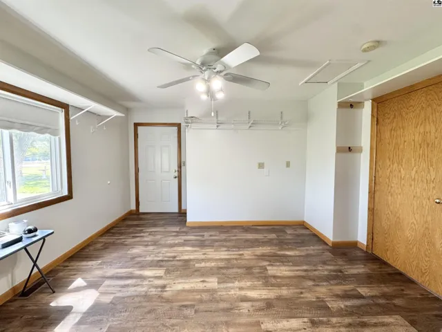 +"PublicRemarks": "Homesteader’s paradise with modern updates and space to grow! This well-maintained property features a ready-to-plant garden and established fruit trees—cherry, apple, pear, and peach. The 2-bedroom, 2-bath home also includes a bonus room with a closet and a large flex space perfect for a mudroom, second living area, or hobby room. Extensively remodeled in 2002 with vinyl windows, updated siding, electrical, and plumbing. The primary bedroom includes a walk-in closet and attached bath/laundry with a new shower installed in 2023. Laminate flooring runs throughout the main living area, and the kitchen boasts solid oak custom cabinets, a dishwasher, and a stove. There is small interior-access cellar basement with furnace and water heater. Outside, you'll find a 2-car detached garage with a new smart garage door opener featuring a built-in camera and auto-close function after 5 minutes. There's also an additional shed with power and an exhaust fan—ideal for a workshop or small equipment. The home is on city water and sewer but includes two wells: one connected to the front yard’s underground sprinkler system and the second for garden hose use. The backyard is fully fenced. Totally move in ready, don't miss out!"