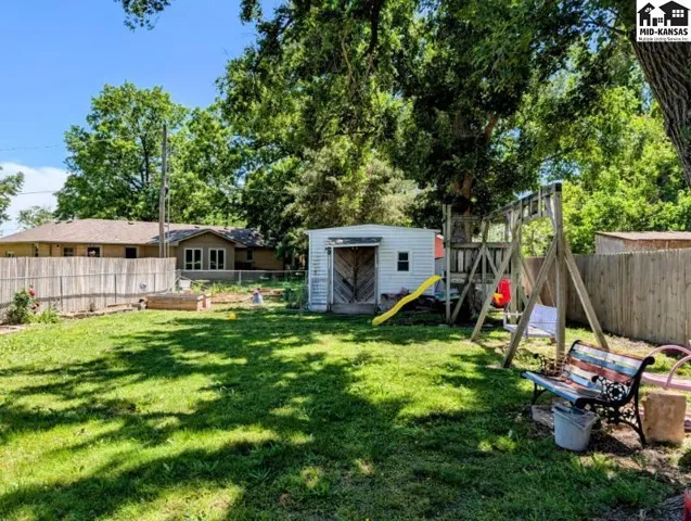 +"PublicRemarks": "This adorable bungalow could be your next home! Low maintenance vinyl siding, roof, gutters, and gutter guards installed 3 years ago. The double pane, vinyl windows help keep energy costs low. You're sure to fall in love with the 1940's charm including the beautiful hardwood floors, arched doorways, and glass knob handles. Two main floor bedrooms and a full bathroom with walk-in shower and built-in vanity. The spacious kitchen has plenty of storage! The main floor laundry is located in the kitchen closet. Just off of the kitchen is a cozy den perfect for a bit of relaxation. Head downstairs to find a family room, bonus area with huge closet, and a storage room where you'll find the brand new furnace. In the fenced backyard, you'll find a nice deck, large playset, storage shed, and a 14'x14' insulated, heated, workshop. Great neighborhood with mature shade trees, close to McPherson Middle School, and Wall Park. You won't want to miss this one!"