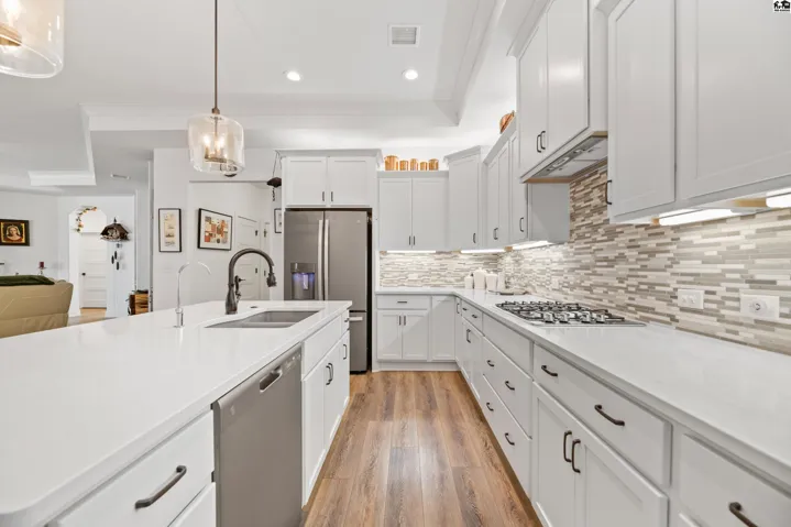 +"PublicRemarks": "Immaculate Zero-Entry Patio Home in the Courtyards at Elk Creek Community. Step inside to discover a beautifully designed living space where the living areas flow seamlessly together. Luxuriate in the 2158 sq ft open floor plan with 9-foot ceilings throughout. Large windows with custom Hunter Douglas Silhouette shades allow natural light to shine in. Power living room shades are remote controlled. Exquisite attention to detail with quartz countertops in the kitchen and bathrooms, hardwood cabinets and drawers with soft close hinges, ceramic tile backsplashes, crown molding ceiling accents, accent wall in the master, epoxy garage floor, stained concrete, sealed driveway, storm doors, in-floor power outlet in living room, and an electric fireplace. The bonus room/den with French doors, sitting room/office in the master suite, and private patio courtyard provide wonderful separate living areas to work, relax, and entertain. Kitchen is perfect for large family gatherings with its expansive counters and grand center island/eating bar that includes electric outlets. GE appliances include gas cook top, dishwasher, built-in microwave, and smart oven. Dream pantry with electric outlet and room for coffee/tea bar and small appliances. Master suite has a fabulous walk-in closet with built-ins, sitting area/office, and direct access to the spacious outdoor patio courtyard."