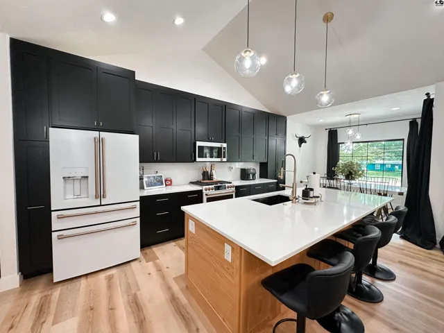 +"PublicRemarks": "Step into over 4,400 sqft of beautifully crafted living space in this 5 bedroom, 3.5 bath showstopper! From the moment you walk in, you'll notice the soaring cathedral ceilings, 8-ft doorways and handmade custom kitchen cabinets and doors that make this home truly one of a kind. The main floor offers the perfect blend of function and style with the open concept kitchen and living area. Dining area with tons of windows to let in tons of natural light. A spacious master suite and full bathroom complete with separate shower, soaker tub and walk in closet. The gourmet kitchen features top-of-the-line Cafe' appliances, custom cabinetry and elegant finishes throughout. The two additional upstairs bedrooms share a stylish jack & jill bathroom, both complete with walk in closets as well. Main floor laundry, a half bathroom off the kitchen area for added convenience and let's not forget about the private office right off the entry way. The fully finished basement provided even more living space with a media room, two additional bedrooms that share a closet with egress, full bathroom, living space and built-in wet bar- perfect for entertaining. Backyard features a covered patio area, hot tub, and plenty of room to play ball or garden. This home is built to last with 2x6 construction for superior insulation, a tankless water heater, 30-yr roof and Pella windows and doors with lifetime warranty. Quality craftsmanship and energy efficiency are woven into every detail!"