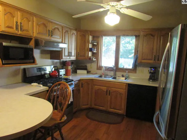 +"PublicRemarks": "Beautiful Brick Ranch on a corner lot. This home has been updated and well cared for. Start with a roomy front porch on the shaded east side of the home which is perfect for morning coffee or a glass of wine in the evening. There are two indoor living areas including a large living room with built-in cabinets and a lower level family room. The "U"-shaped kitchen features oak, raised-panel cabinets, wall and floor lazy susan cabinets in both corners, a full kitchen appliance package, a twin casement window over the double-basin kitchen sink, an amazing pantry cabinet and a breakfast bar. The home has four bedrooms including an owners en suite with double lavatory and spacious shower, plus two more bedrooms on the south side of the living area and a large 4th bedroom at the lower level with an egress window. There are also three bathrooms including the owners' private bath, a 2nd bath between the 2nd and 3rd bedrooms on the main floor, and a 3rd bath opening to the lower level bedroom and family room. The main level laundry is between the garage and kitchen and has extra cabinet storage. You have to see the amount of unfinished storage downstairs. Next to the dining area is a sun porch which opens on to a patio. The back yard features a wood privacy fence, a storage shed, and mature trees and landscaping. The home has an underground sprinkler system and a large back-up electrical generator. This is a home you will be proud to own."
