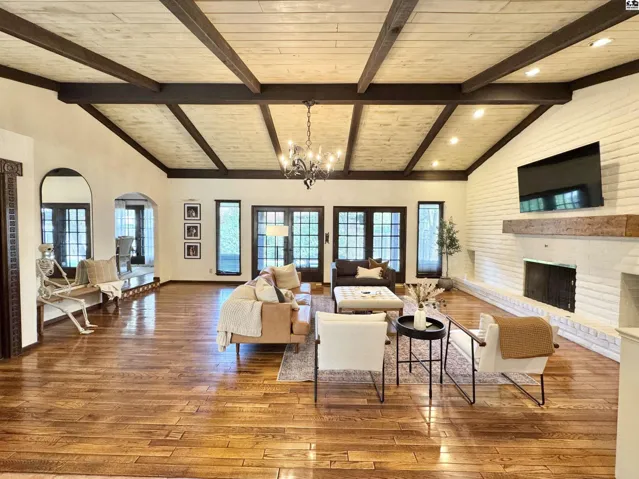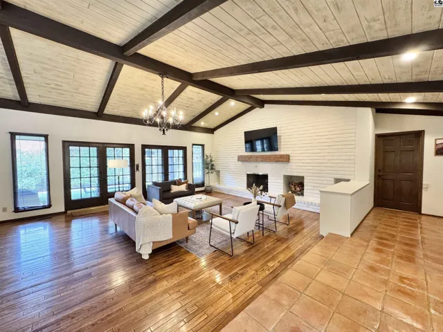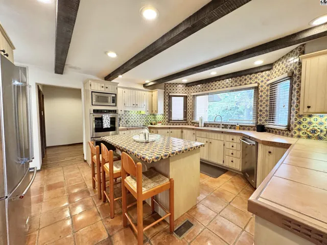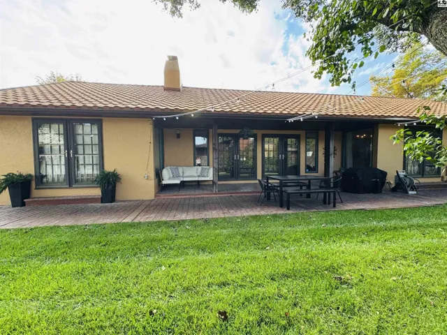 +"PublicRemarks": "Beautiful Southwestern-style home w/custom craftsmanship & rich artistic details throughout. Private courtyard features fountain imported from Mexico, and front door was hand-carved by nationally recognized artist Mike Livingston. Inside, Saltillo tile and hand-scraped hardwood floors extend throughout the home. Livingston’s work continues with bronze star-trimmed kitchen countertops and handcrafted mirrors in both the guest & primary baths.\u{A0} The formal living room features a European-imported chandelier, a custom mantle, and imported doors that open to a wet bar. French doors from both the living room and formal dining room lead to a private covered patio, creating seamless indoor-outdoor living and entertaining opportunities.\u{A0} The kitchen has center island, double convection ovens, and brand-new refrigerator. All three main floor bedrooms include attached bathrooms. The spacious primary suite includes 2 walk-in closets, built-ins, jetted tub, walk in shower, and dry sana!!\u{A0} A versatile bonus room on the main floor can serve as a sunroom, den, or home office.\u{A0} Basement includes a finished family room and a large unfinished area that offers storage or the potential for future expansion. An egress window is already in place, making it easy to finish the space into an additional bedroom and/or additional living area.\u{A0} Other upgrades include a Class 4 IR metal roof installed in 2022, a new west AC unit installed in 2024, and most windows replaced."