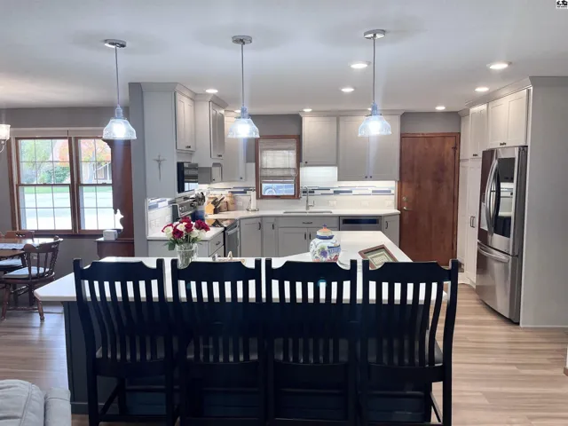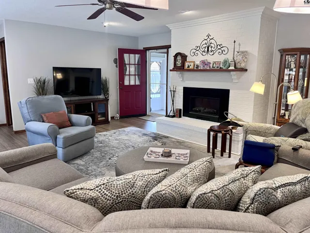 +"PublicRemarks": "Welcome to this stunning one-level 3 bedroom, 2-bath brick home nestled on a quiet, tree-lined cut-de-sac. Step inside to find a completely remodeled interior featuring an open floor-plan and designer finishes throughout. The gorgeous kitchen is a true showstopper with quartz countertops, soft-close cabinetry with pantry and pull-out storage. Relax in the living room with the beautiful electric fireplace with heat feature., or step into the screened-in porch with charming beamed ceiling, perfect for enjoying quiet mornings or evening gatherings. The patio extends your living space outdoors, and is surrounded by impeccably maintained landscaping and a privacy fenced in yard. The master suite is spacious and the master bathroom features an onyx shower with seat. The extra space in the large attached laundry room is currently being used as an office, but would make a great walk-in closet! New roof & guttering to be installed soon."