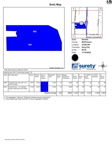 +"PublicRemarks": "Located just outside of the City of McPherson is 60+/- acres of productive cropland. This farm is entirely tillable comprised of Class II Silty Clay Loam with a weighted average NCCPI of 55. The farm has a history of raising corn, soybeans and winter wheat. This is a manageable sized addition to your farm operation with likely accounting benefits from excess soil fertility. The field is currently fallow with possession available for spring planting. This available parcel would make an excellent build site for a short commute to a rewarding career. There are several suitable locations to build a custom home or barndominium. Electricity is available along the west boundary at 16th Avenue. This site is close to City amenities but situated at the end of two dead-end roads that are rarely traveled, so you get privacy and convenience. This farm is also a great hunting spot for ducks and geese feeding in the cut cropland stubble. Make this tillable investment another family hunting spot with the addition of a heated pit blind centered in the field. Waterfowl numbering in the tens of thousands winter in the City Limits of McPherson on bodies of water off limits to hunting, they take flight each morning and evening and flock to this field to feed on waste grain Call to Schedule a tour. -100% Productive Cropland -Class II Soils -Immediate Possession available -Excellent Buildsite -Available Electricity -USD 418 McPherson -Nearby Employers and City Amenities"