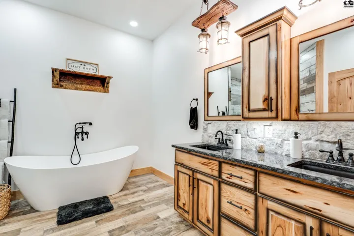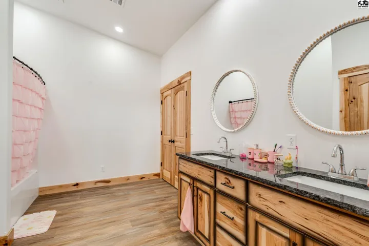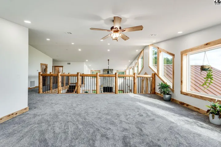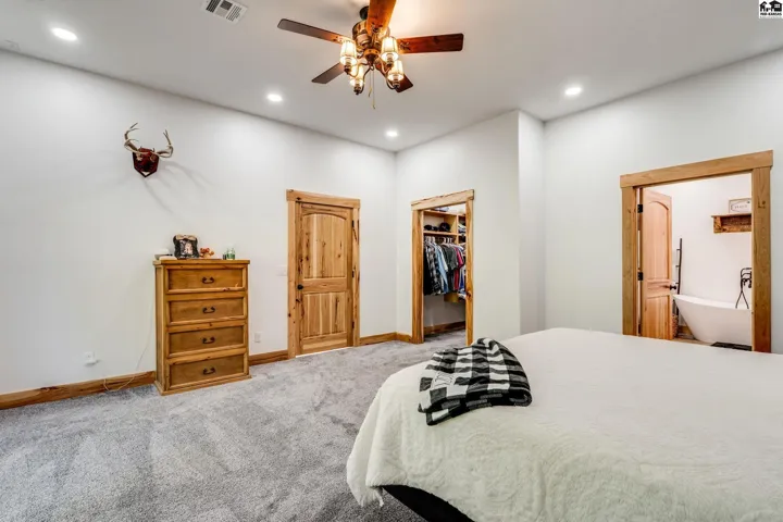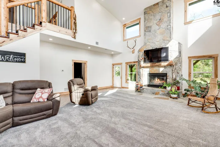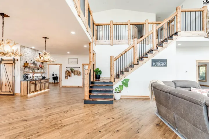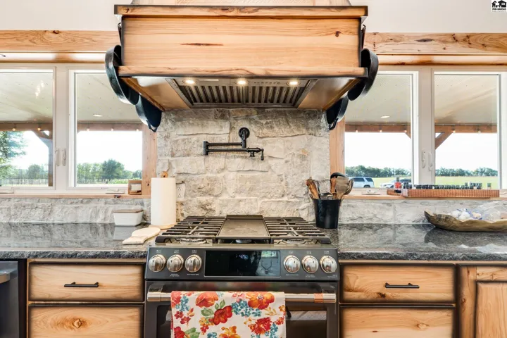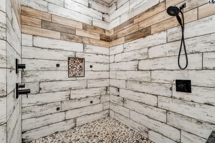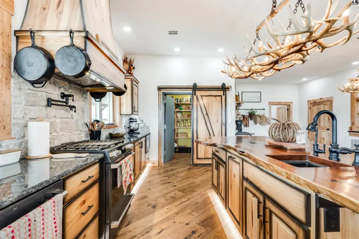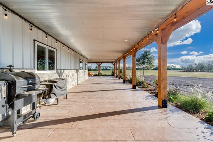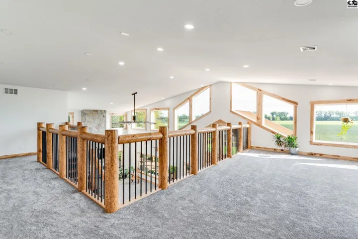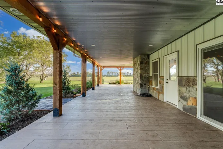 +"PublicRemarks": "Your luxury Kansas whitetail deer hunting property is here. It feels like you just pulled up to a cabin in the mountains with meticulously landscaped trees, irrigated flower beds, curbing, irrigated yard with sod. A massive wrap-around porch offers outdoor covered space to spend the evening in the hot tub, or watching deer. The garden is fully irrigated with UGS to grow the best veggies! Whole house generator automatically kicks on in case of power outage. Back side of the home has a lean-to for a side-by-side, trailers, and outdoor storage. Fenced pasture for horses or cattle! Pasture can support 25 pairs, rented last summer for $10,000. 10 acre wooded area is great cover for Kansas hunting whitetail deer, turkey or small game. Enjoy the feel of the engineered hardwood under your feet! All the cabinets are custom made hickory cabinets topped with granite and the island and stairs have live edge walnut. The kitchen features a coffee bar and walk-in pantry that doubles as a safe room. Master en suite on main level with a jaw-dropping walk-in shower, free standing tub and double vanity. The main level features a floor-to-ceiling fireplace with real stone. The upper level features a loft, remaining bedrooms and bathrooms. Spacious laundry and mud-room is a great transition between the home and shop with plenty of places to drop shoes and bags. This spray foam insulated shop features an office on the main level with lofted room above, a second full kitchen and 5th bathroom."