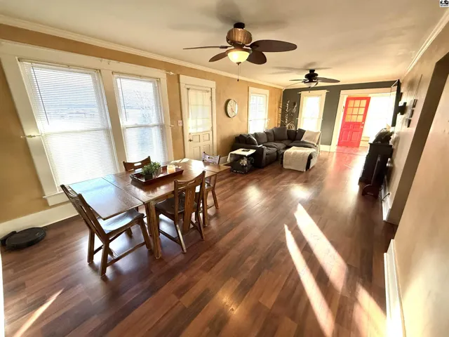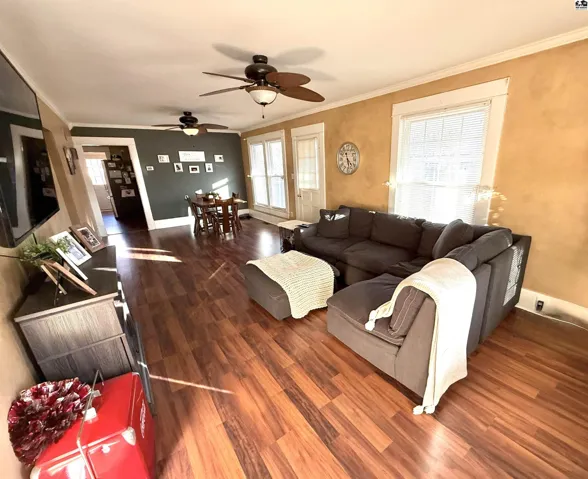 +"PublicRemarks": "This charming home features a wrap-around porch that welcomes you into the foyer and leads to a spacious living room area, which can also serve as a combined living and dining room. The large kitchen is equipped with stainless steel appliances, an island, and an eatingnook with additional storage. Two bedrooms on the main floor offer sizable closets and share a full bathroom that includes a shower/tub combination. The full basement offers more living space with a family room, a large bonus room and a storage/utility room. Outside, thefenced backyard is an oasis, complete with a covered patio, two pergolas, and a fish pond. The detached garage offers both parking andhobby space, accessible from the alley and leading into the covered patio area—ideal for entertaining or outdoor activities. Additional features of the home include a main floor laundry room and a whole-home generator. Many updates have been made over the past eightyears, including a high-efficiency HVAC system, exterior paint, a new roof, gutters, and porch posts. This home is situated in a lovelyneighborhood, conveniently close to several parks, a local swimming pool, and the downtown area."