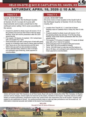 +"PublicRemarks": "Tract #2 130.6 acres located in the Northeast Quarter of Section 20-25-4 except 28.9 acres with improvements and except a small tract in the northeast corner selling 130.6 acres according to the survey · Cropland is planted to wheat, buyer will receive 1/3 of the growing crop and pay their share of the top dress fertilizer, buyer will receive possession after the 2026 wheat harvest · FSA reports 129.4acres of cropland, 129.4 wheat base with a 42-bushel PLC Yield · Good productive soil with a rolling tract of land with good access on a blacktop road close to Haven grain terminal · Total Taxes are on the improvements and the land; $3022.40 to be split out and prorated at closing · Terms: $50,000 down, balance is due in 30 days not contingent upon financing, down payment is nonrefundable. Being Auctioned with MLS #54052 AND 54084 TRACTS ARE NOT COMBINED BUT SELLING ON SAME DAY. ALL TRACTS ARE STAND ALONE!!"