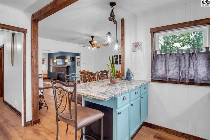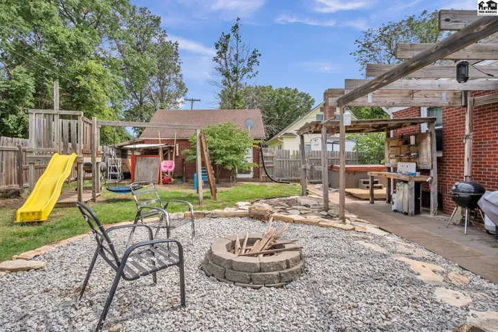 +"PublicRemarks": "Check out this beautiful brick bungalow home full of charm, character, and fantastic updates. This 3-bedroom, 2-bath home offers an inviting open floor plan where the kitchen, living, and dining areas flow seamlessly together, creating the ideal space for everyday living and entertaining. The kitchen offers a warm rustic feel, complete with granite countertops, abundant cabinetry, and appliances. 3 bedrooms, a full bathroom, and a mudroom with 2 large cedar-lined storage areas and a spacious pantry complete the main floor. Downstairs, the finished basement expands your living space with a large family room, a bonus room, a large walk-in closet, a kitchenette, a full bathroom, and an oversized laundry room/mechanical room. Enjoy your own private outdoor retreat in the fully fenced backyard that features an above-ground pool, hot tub, and fire pit. A new wood deck on the south side of the home adds ever more outdoor enjoyment. Location is everything, and this home delivers, being within walking distance to schools, parks, the city pool, tennis courts, pickleball courts, disc golf, a walking path, and all the downtown amenities. The 2-car detached garage offers plenty of room for your vehicles and all the extras. New improvements include basement windows 3/26, new roof 11/25, water heater 2026, and heating and air in 2025. Call to see this gorgeous home that perfectly blends comfort, functionality, and location. Seller is a licensed Real Estate Agent in the State of Kansas."